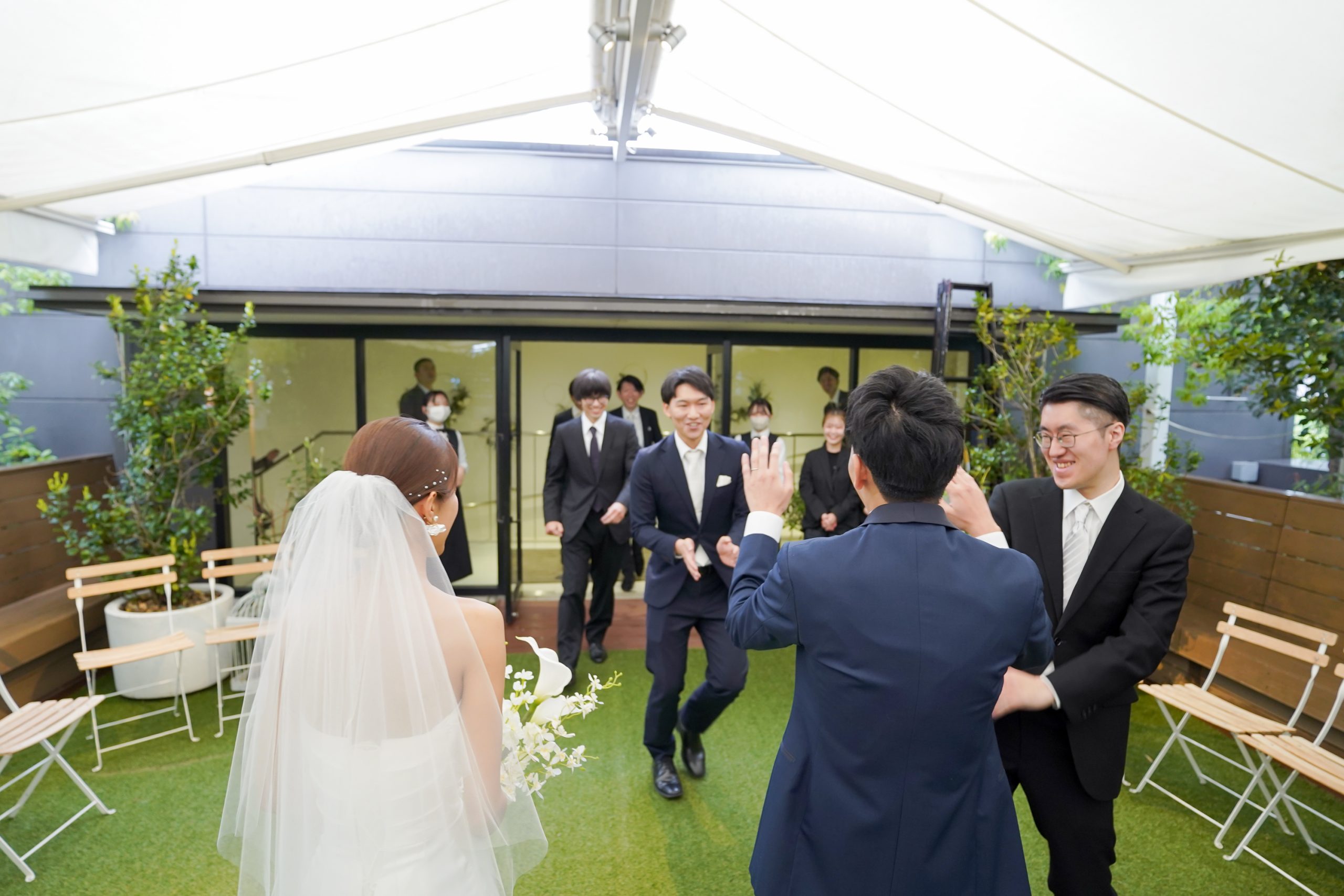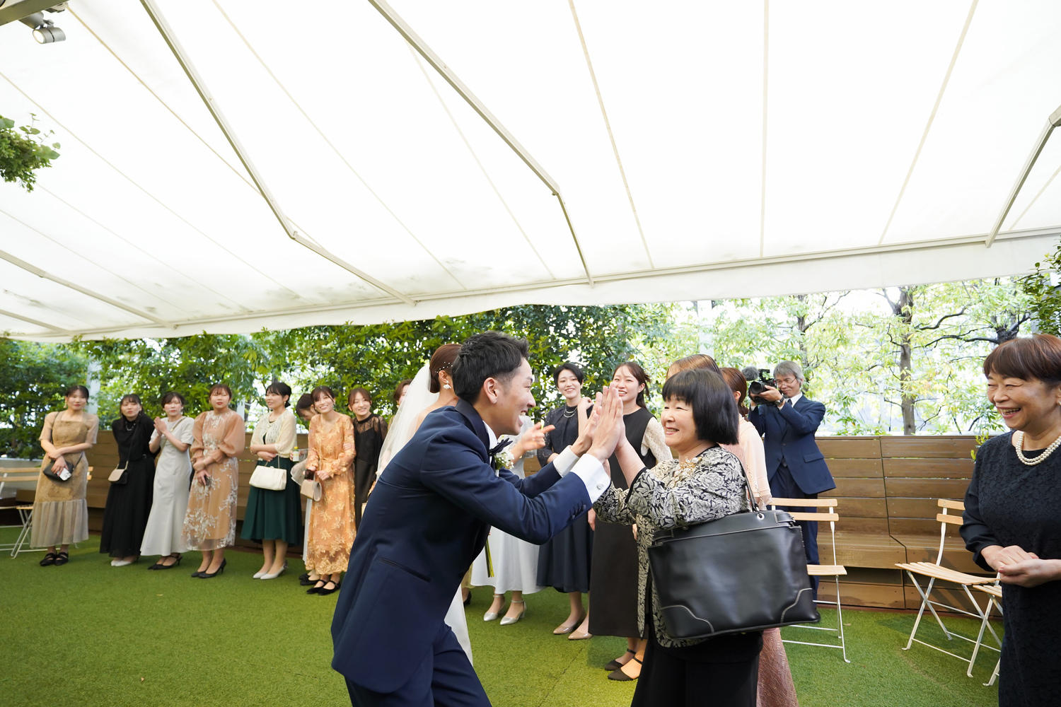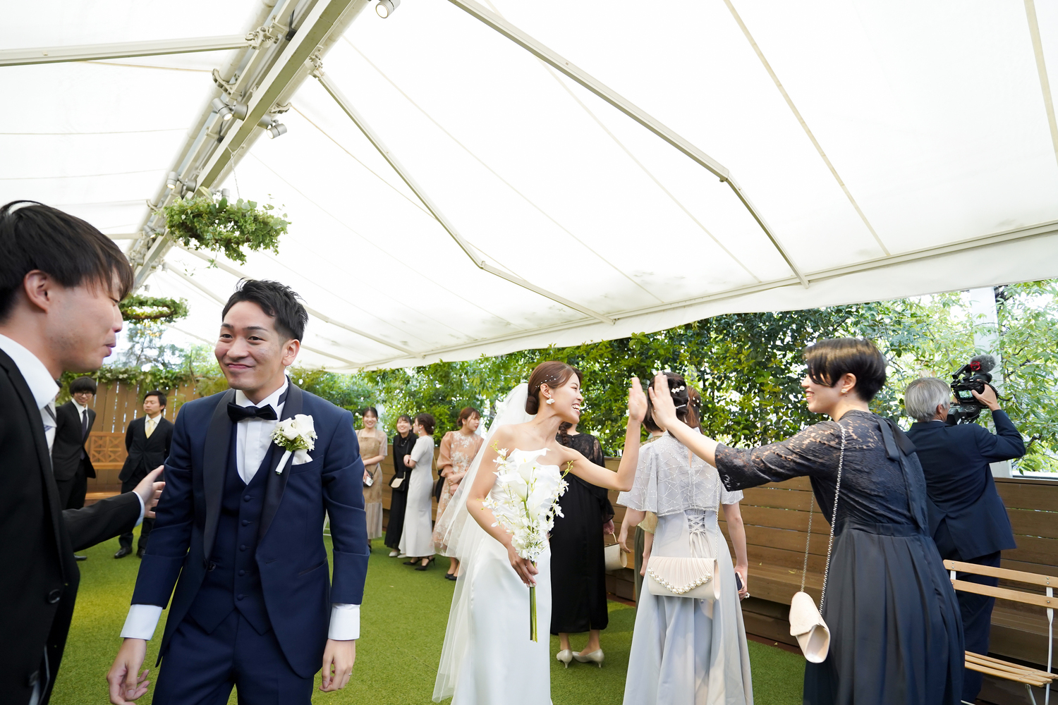 挙式後ゲストの皆様がガーデンセレモニーへと向かうと そこには新郎新婦様が