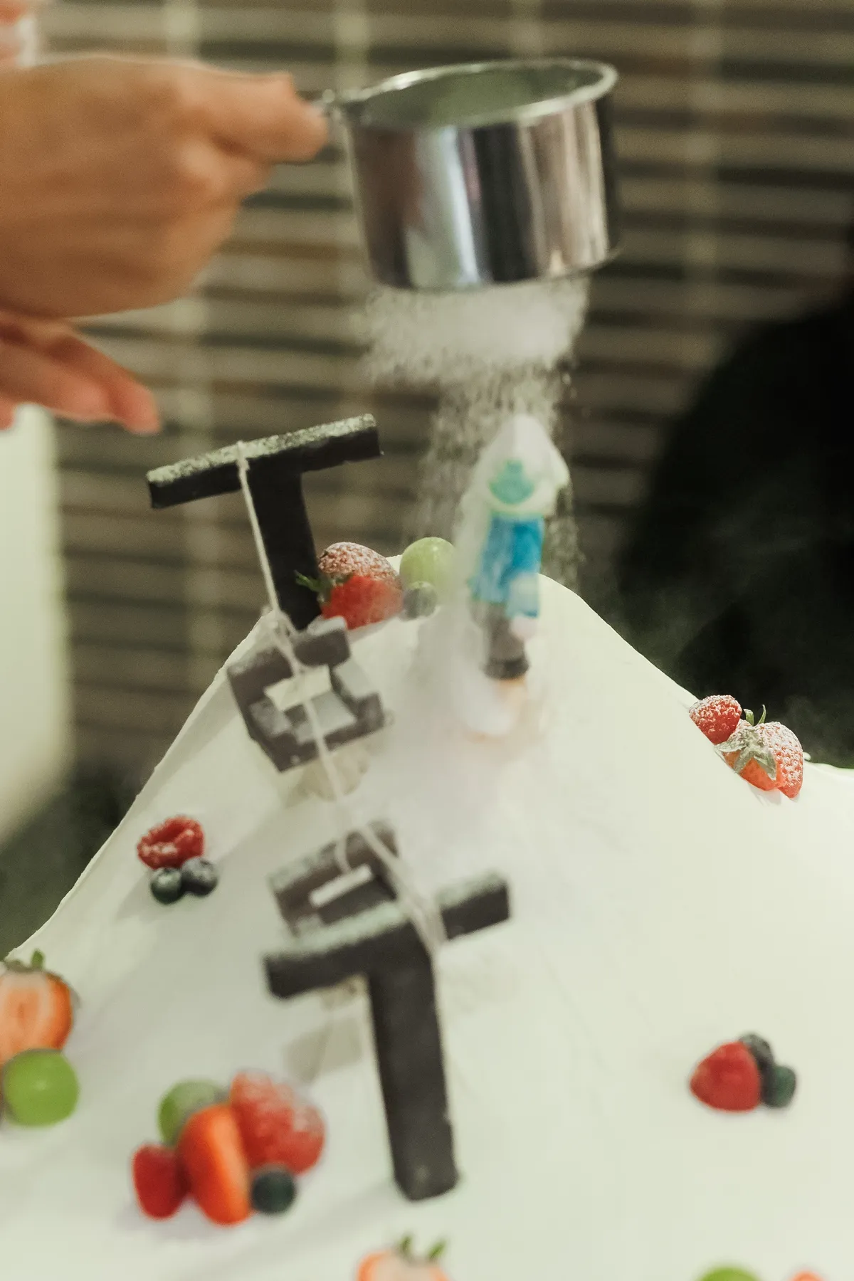 雪に見立てた粉糖を振りかけるケーキデコレーション